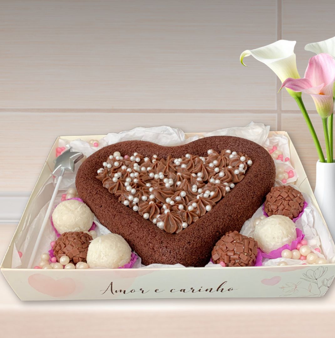 Um bolo coração recheado com brigadeiro e decorado com pérolas comestíveis, 6 brigadeiros gourmet, 1 vela, 1 cartão de parabéns ou outra msg, 1 caixinha embalada com fita de cetim.